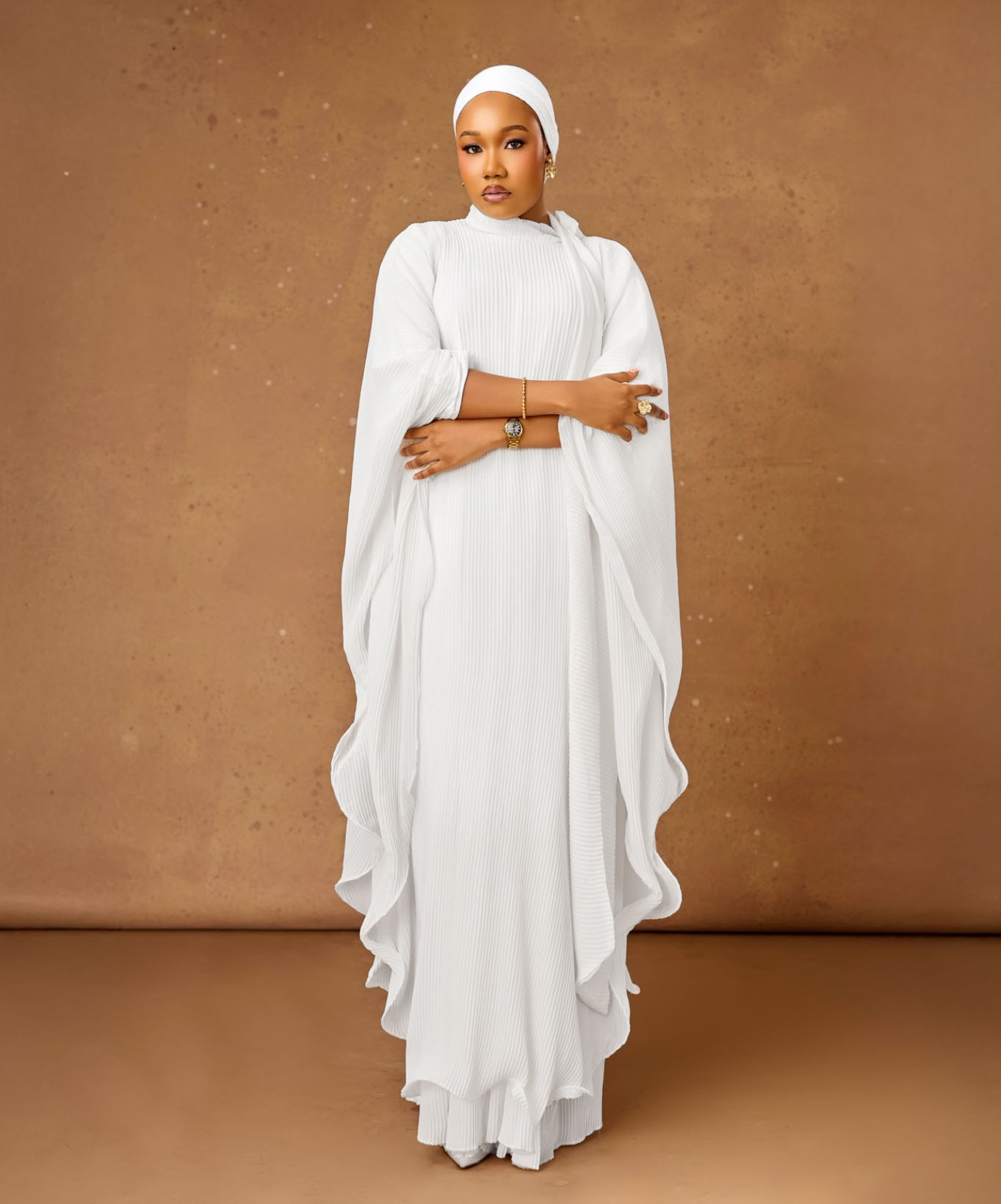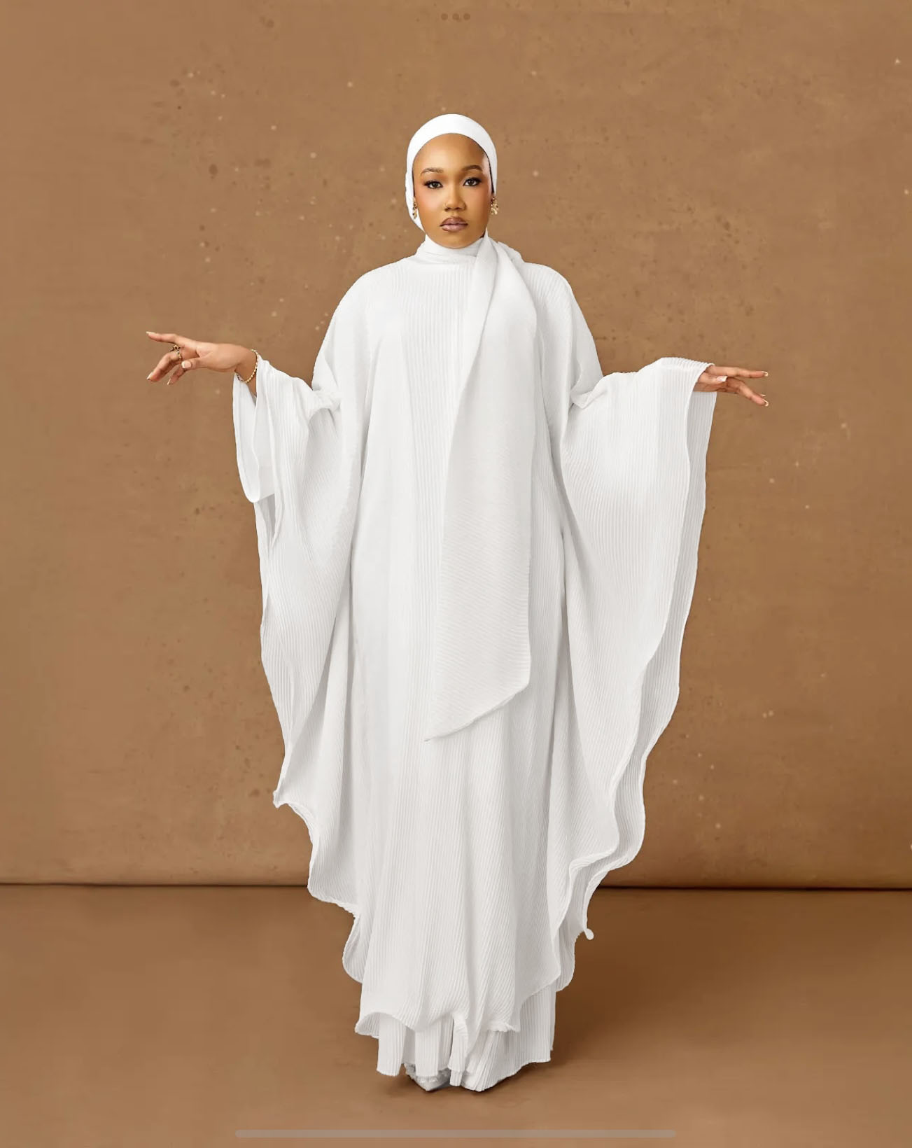 This two-piece ensemble features a straight inner dress with flare sleeves and closed slits for modesty, paired with a free-flowing outer layer that can be worn open or belted for a refined silhouette. Made from premium brocade and organdy, it’s lightweight yet richly textured perfect for Eid, weddings, and special occasions.